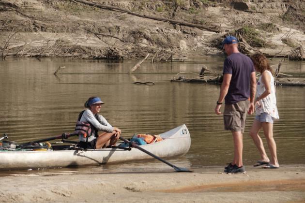 The dog shown here has nothing to do with it, except its owners were on the sand bank of the river near its last bend before the bridge. They offered Falterman a Corona as she approached, and with family and friends waiting to welcome her a little further upstream, and all of them wondering what she was doing, Falterman took advantage of the invitation to stop and talk for a bit with the couple who would be the last new friends she would make on this trip. Then she climbed back in her canoe and rowed the last 400 yards or so to where her parents were waiting.