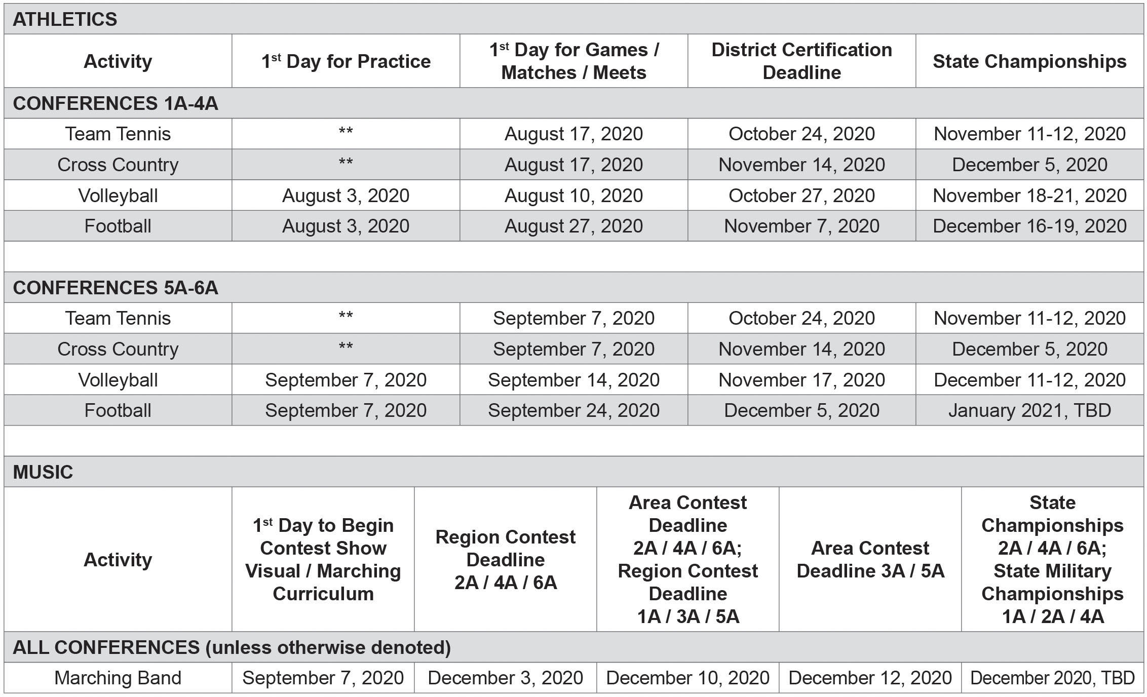 The modifications to the 2020-2021 calendar differ by activity and conference and can be found on the UIL website and in the chart below. These adjustments reflect the public health situation at this time and the varying numbers of COVID-19 cases across different geographic areas of the state. This plan provides a delay for schools in highly-populated metro areas, primarily conferences 5A-6A, given the challenges with COVID-19 those communities are facing, while providing schools in other areas, primarily 1A-4A, an opportunity to start seasons on schedule. Acknowledging the situation is not always clear-cut and that COVID-19 affects every community differently, the plan also allows for local flexibility and encourages districts to plan for possible interruptions in order to complete district seasons.